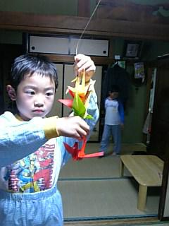 我が家の茶の間の電気の‘ひも‘のところに、P君が自分で折った‘つる‘をつけてくれました・・・(-"-)