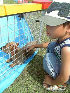 子犬とヤギとウサギと子猫がいましたが、昨日のあの暑さ・・・動物たちもぐったりで、ヤギなんて、ブルーシートのなかに入ってっちゃうし、子犬たちは‘氷‘なめに夢中だし・・・しかし!!P君から‘ぜったい触ってやる!‘・・・っていう