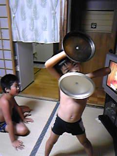 この前、P君がパンツ一丁で鍋のふたを両手に持って叩いていました・・・。