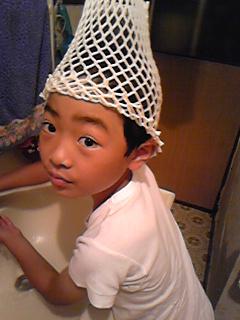 頂き物のメロンにかぶせてあったネットを、帽子代わりにかぶってるP君・・。