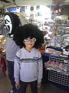 P君とに〜にがお土産屋さんにあったアフロのかぶりものをかぶって