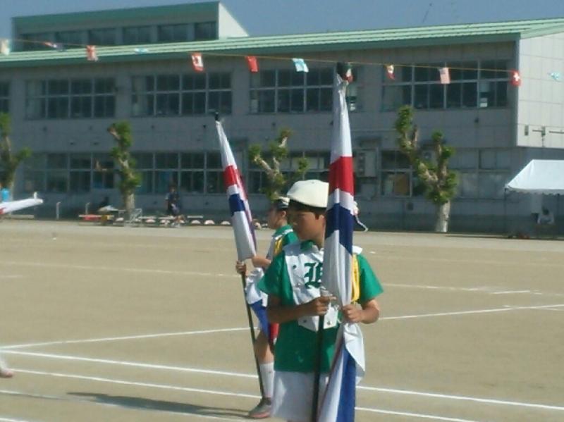 運動会の鼓笛で、フラッグ担当のP君・・・。