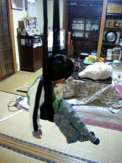 ぜんぜん話は変わりますが、写真のP君が乗ってるのがじ〜じお手製(?)のブランコです!(ブランコにはあまり見えませんが・・・)P君の大のお気に入りです!