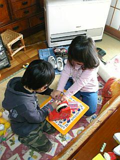 Sちゃんのお兄ちゃんと、我が家のに〜にがお友達で、一緒に遊びにきてくれました〜!!に〜にグループにはその他もろもろとお友達が遊びに来てたので、P君とSちゃんとママとで、折り紙やったり、お絵かきしたり、おままごとなんかで遊びました・・・。に〜にのお友達なんかも‘ちびっこチーム‘の遊びがきになって「なにしったな〜?」なんて顔だしてみたり・・・それぞれとっても楽しかったようでした・・・(^_^)そろそろSちゃんたちのママがお迎えにくるね〜なんて話してたら