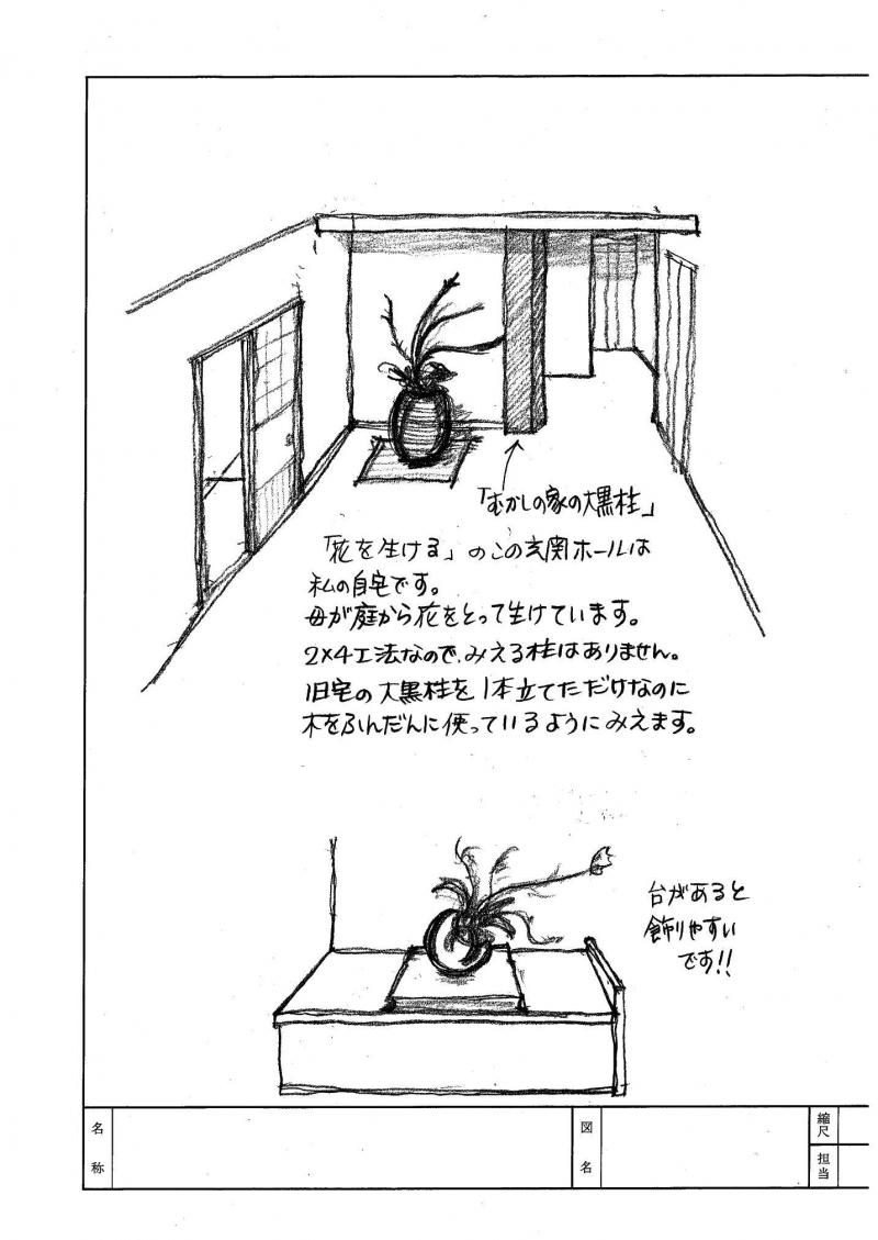 玄関先にはいろんなお花を大きく生けたいから飾り棚はつけませんでした。
