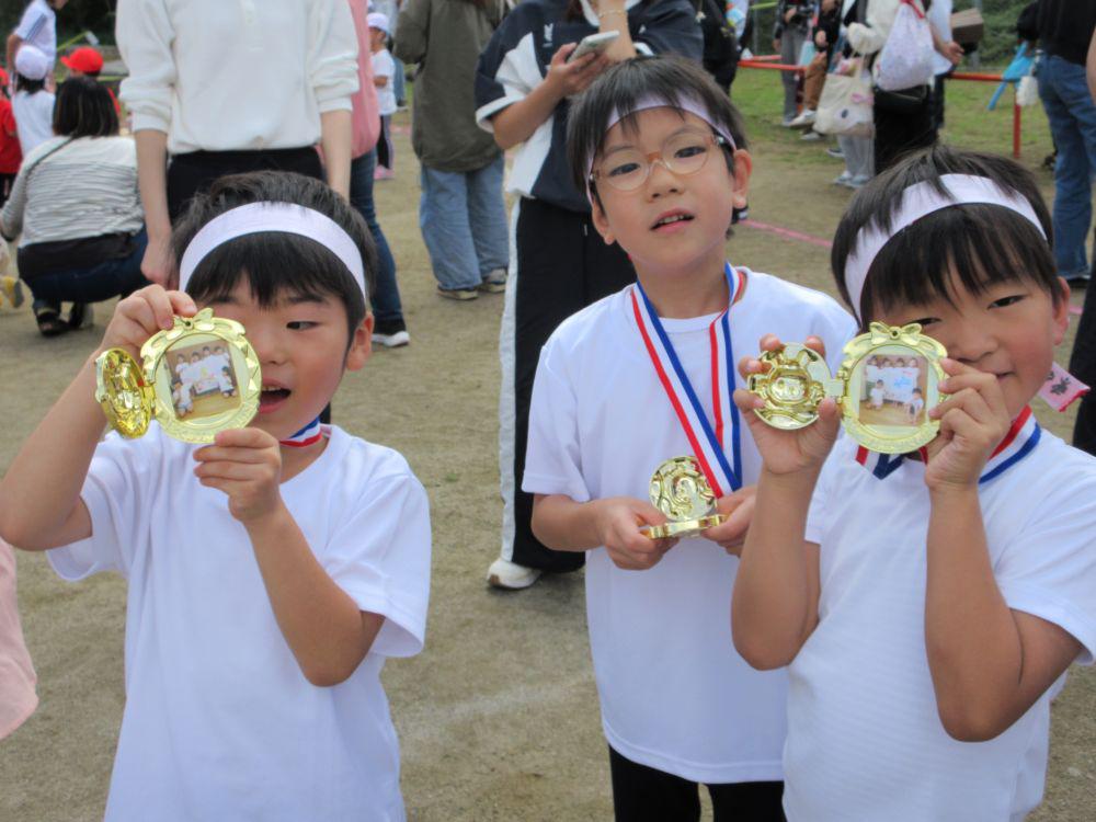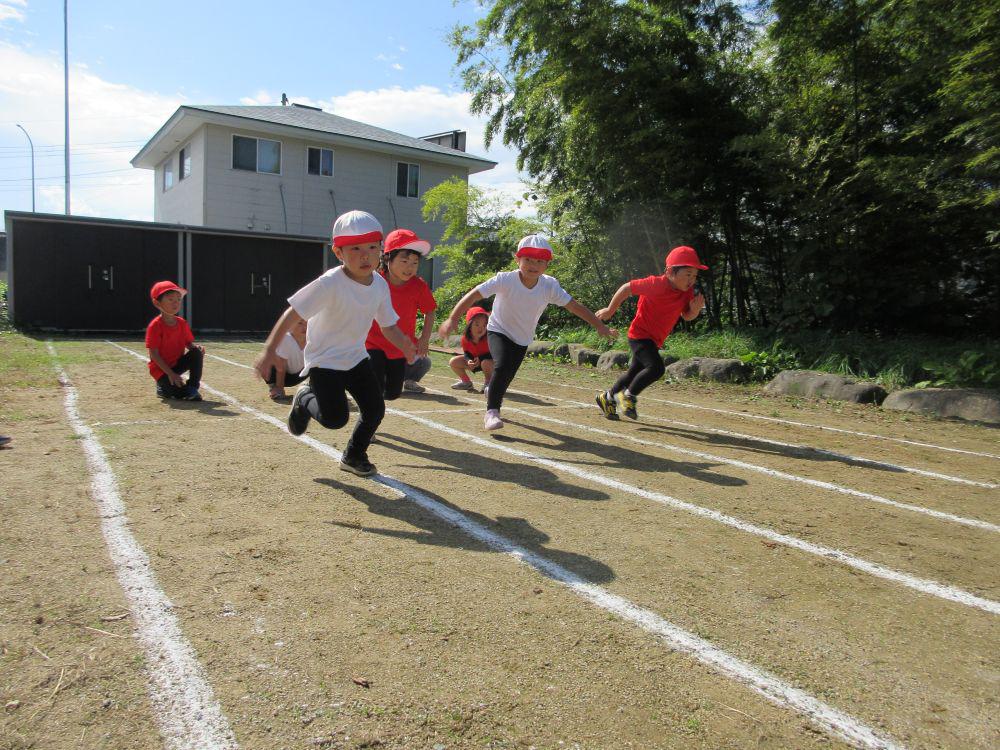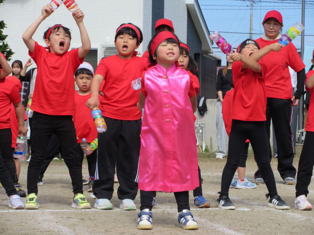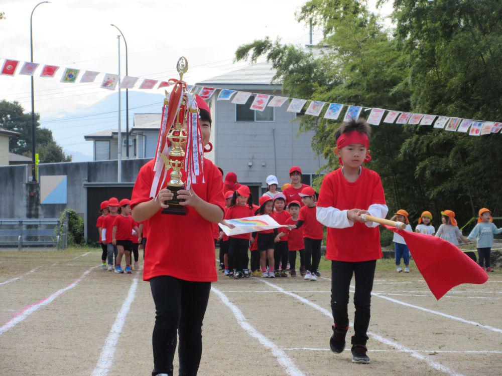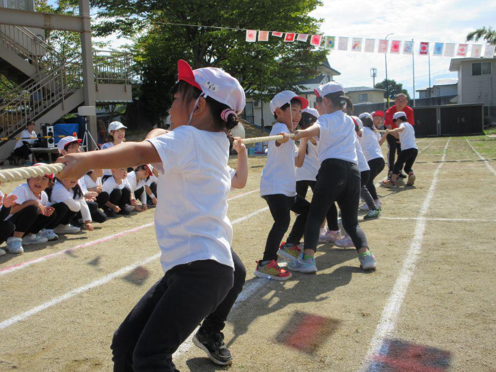 2歳児組から園庭で運動会に参加しました。赤組、白組にわかれ、かけっこ、玉入れ、綱引きの他に、組別対抗応援合戦や年長組親子リレーなど行いました。異年齢競技やリレーなどで励まし、協力し合い、勝って嬉しい!負けて悔しい!を経験し団結力がつきました。