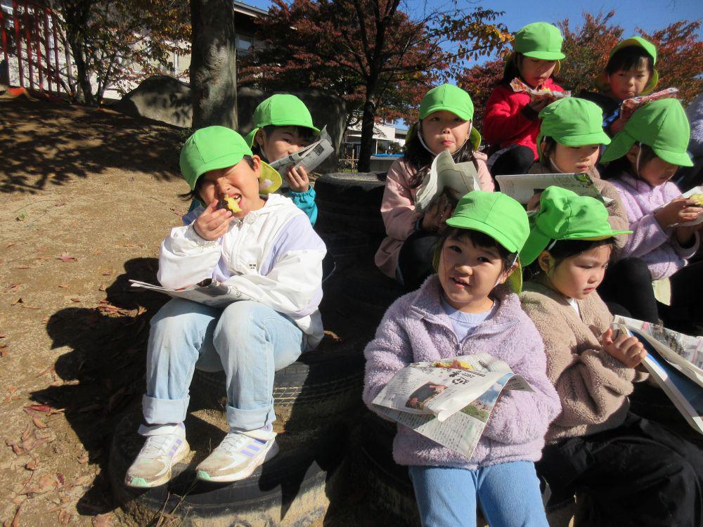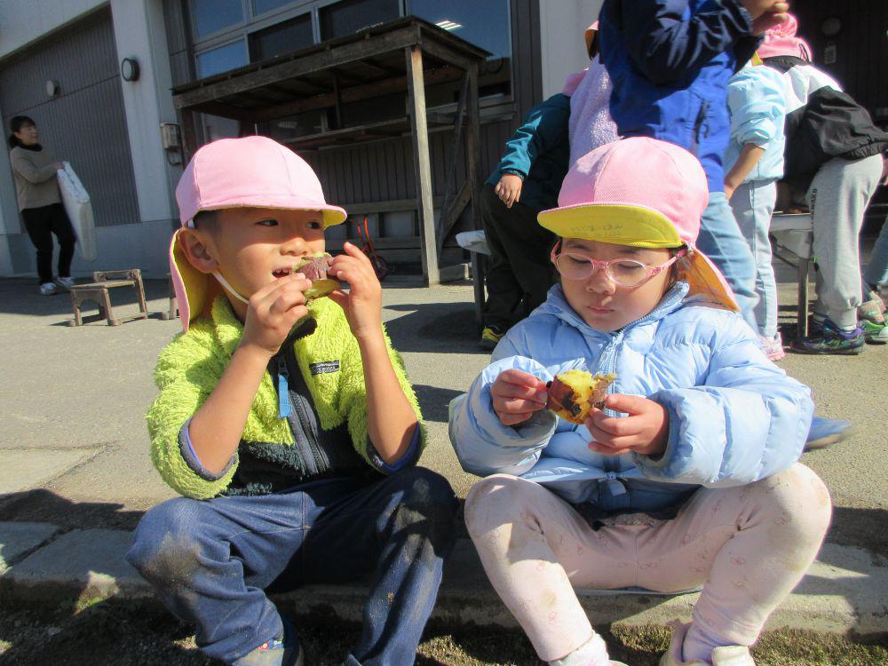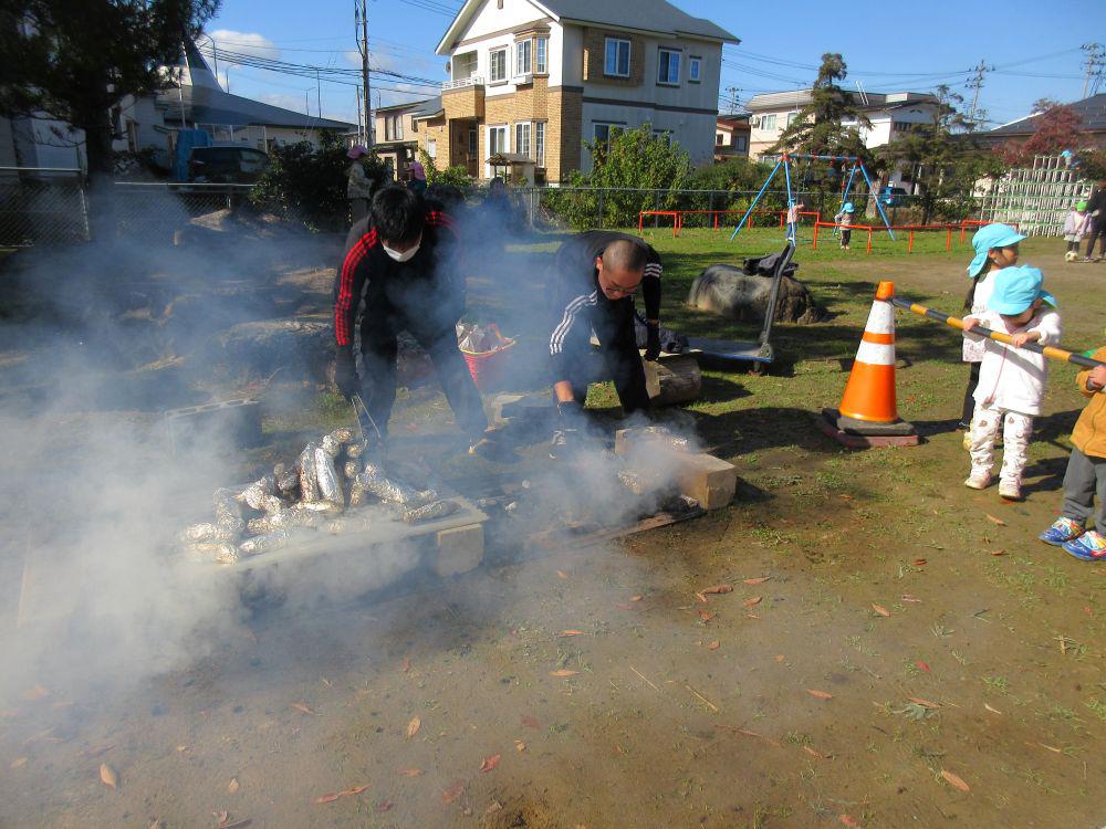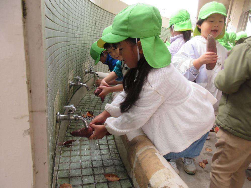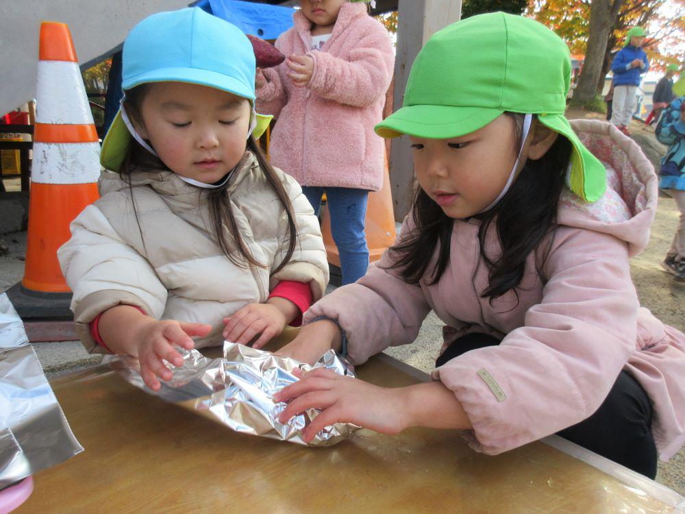 年長児さんに教えてもらいながらサツマイモをきれいに洗って、新聞紙やアルミホイルで包みます。煙が上がると「くさい」「けむい~」と大騒ぎです。ほかほかやきいもに「もっとたべたい」とおかわりを催促してみんなで食べました。