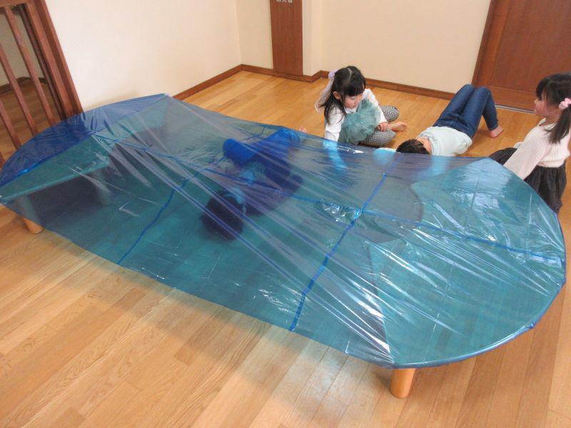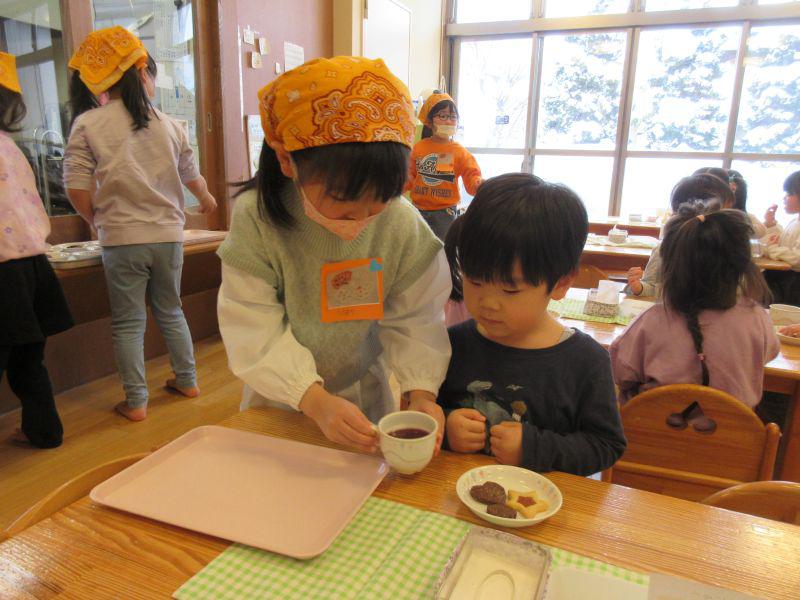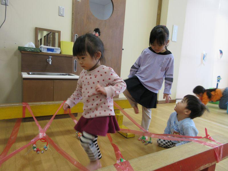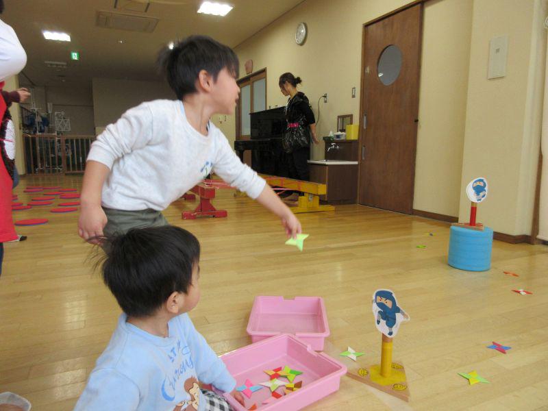 楽しい遊びのコーナーということで、映画館、忍者修行、コイン落とし、金魚すくいなど楽しみました。忍者修行では鈴の音がならないように歩いたり、くぐったり、円形渡り歩きをしました。おやつは「ゆりくみやさん」のカフェに年長児が案内してくれて、クッキーやマシュマロサンドをごちそうしてくれました。