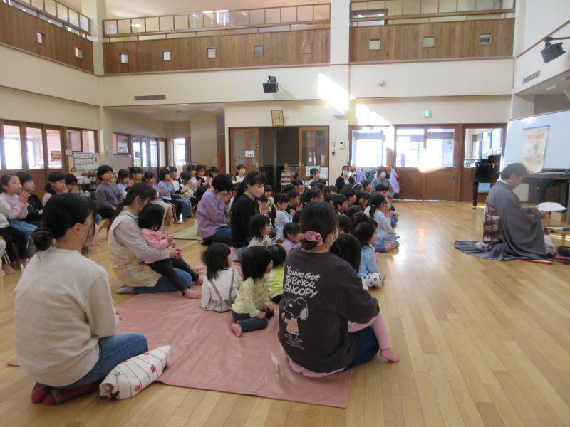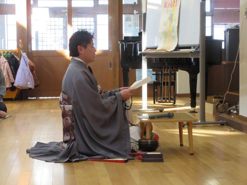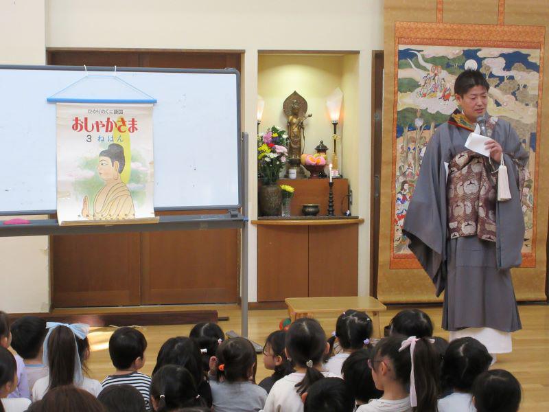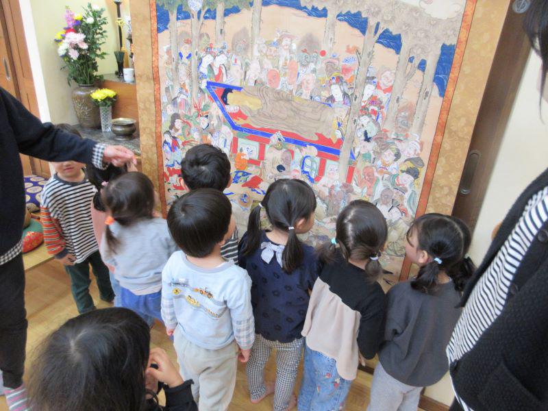 お釈迦さまの命日である、涅槃会を行いました。お経を聴き、お釈迦さまが亡くなられた時のお話を通して、命の大切さを改めて考える機会となりました。涅槃会の由来を描いた紙芝居では、子どもたちの表情も自然と引き締まり、どの子も真剣な表情でお話に聞き入っていました。