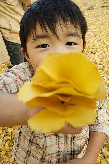 小さなお友達が落ち葉を集め、「口だぞぉ〜〜」っと♪