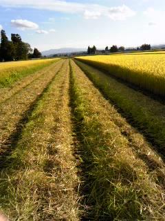 稲わらは、長めに切り落とし乾燥させ牛に与えます。