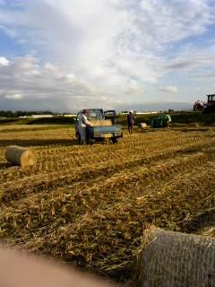 明日雨が降る予報なので、今日は稲刈りを休んで、牛の餌になる稲藁を少しですが集めました。