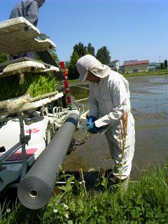 無農薬米は紙を引きながら苗を植えるので専用の田植え機を使います。