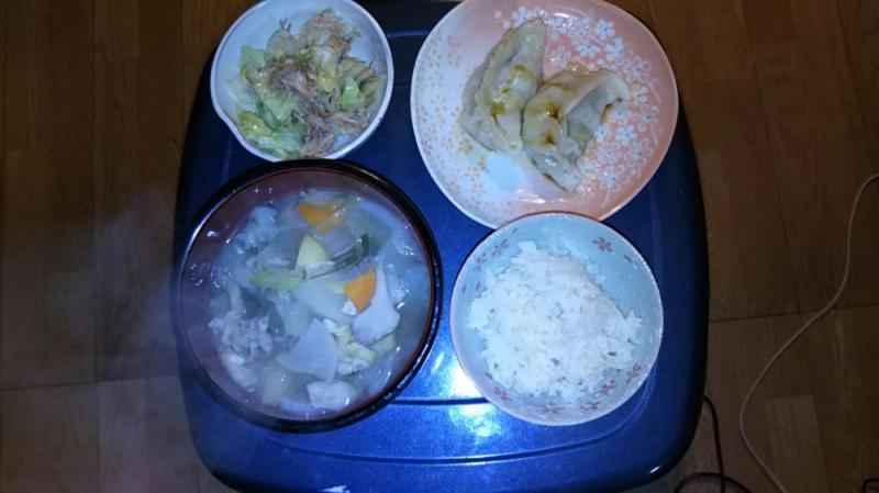 野菜高騰の為保存食の大根を沢山使って豚汁を作りました。ご飯はもちろん胚芽米です。いつも生姜、ニンニクを使うので同じ味になってしまいますが、健康の為と思って食べて欲しいですね?