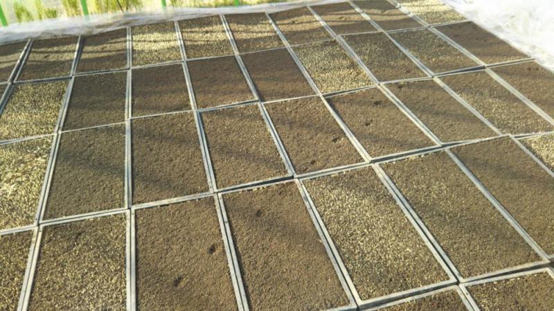 つや姫がハウスに並びました。すかさず猫が苗箱の上を歩いて行ってしまった??ア ア、 、なんということを