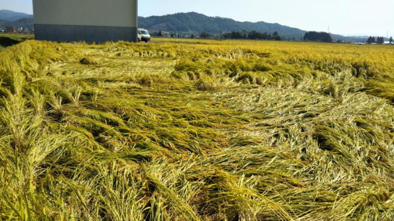 長雨の影響で倒れてしまいました。コシヒカリは丈が長く天候に左右されやすい品種ですが、丈のあるワラは牛の餌用にしています。