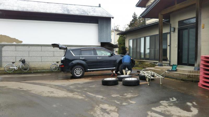 タイヤ交換しています。雪は朝から降っています。平地にも冬がやってきました。