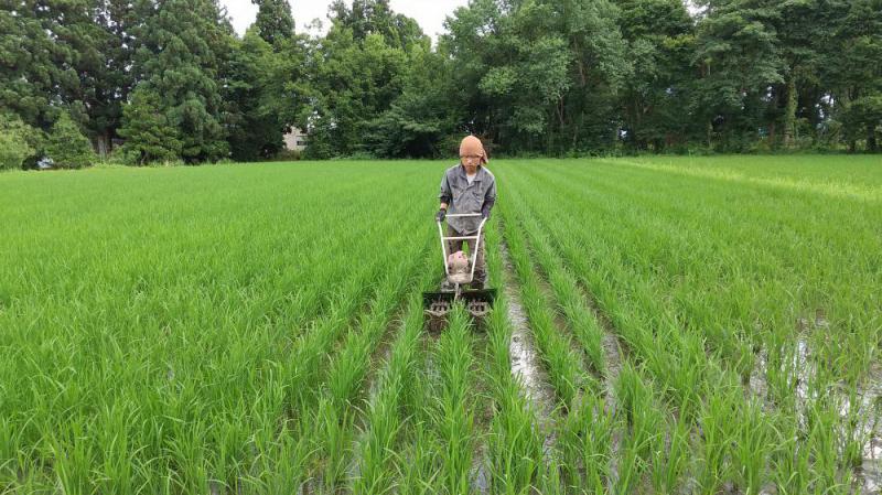 田んぼはヒエやホタルイという雑草がびっしり生えています。除草機で土をかき混ぜ土の中に埋めていきます。100メートルもある畦道を何度も往復です。暑い日は大変……。