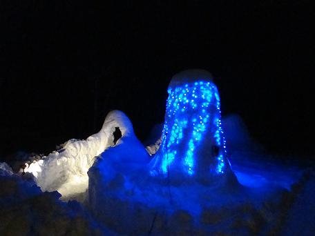 裏磐梯高原ホテルのガーデンにイグルーを制作して以来、さまざまなオブジェが誕生しております。そのなかでも一番大きくそびえ立つスノータワーにLEDを散りばめてみました。幻想的なブルーの光がとてもキレイです。