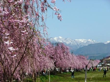 裏磐梯高原ホテルより西へ30kmほどクルマを走らせると、喜多方市がございます。会津の観光スポットの中心は鶴ヶ城や飯盛山などのある会津若松市になりますが、ここ喜多方市も観光資源が豊富にございます。喜多方市といえば「蔵の町」として有名でございますが、最近ではご存じのように「喜多方ラーメン」が全国的にも知名度をあげて参りました。遠く飯豊連峰を望み、緑に囲まれた喜多方市で間もなく約1000本の「しだれ桜」が満開になろうとしております。
