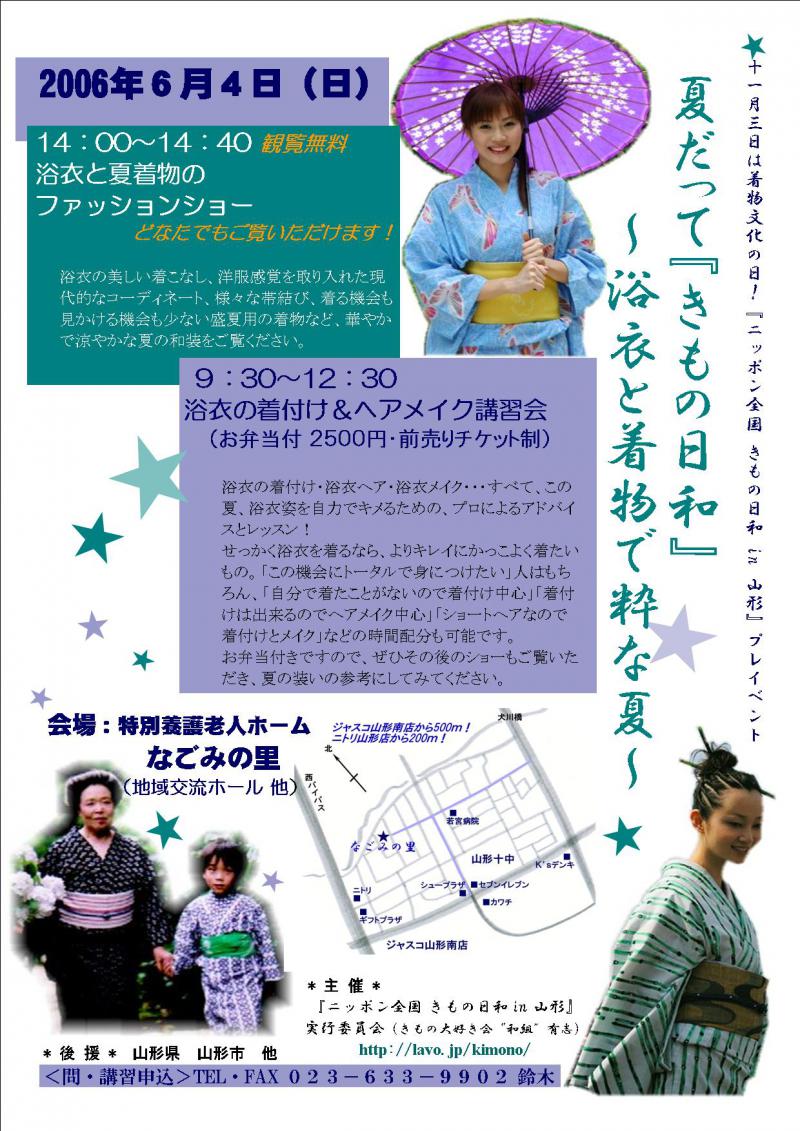 夏だって『きもの日和』! 〜浴衣と着物で粋な夏〜 (『ニッポン全国 きもの日和 in 山形』プレイベント)のチラシ・ポスター、やっと作り上げました。