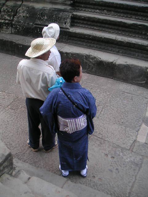 中心の第3回廊に行くにはロッククライミングのように這い上がって行かなきゃならないアンコールワットで着物姿を発見!!