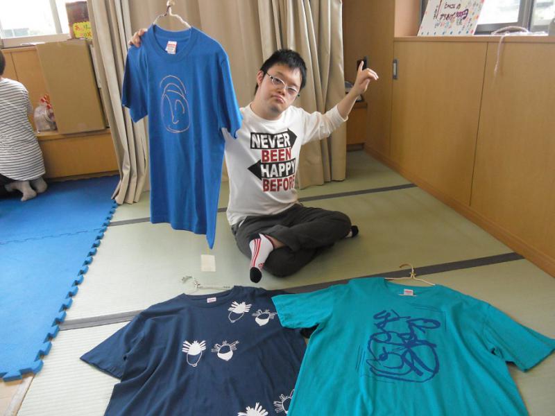 利用者さんが心を込めて描き上げ、職員が丹精込めて刷り上げたTシャツの数々、