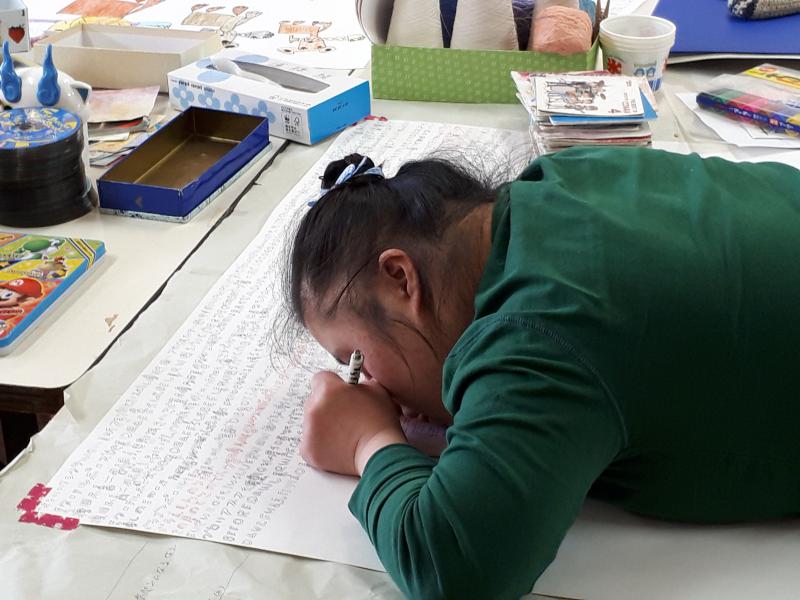 あとりえチーム、さっそくそれぞれ心に浮かんだものを、思い思いに表現しています。