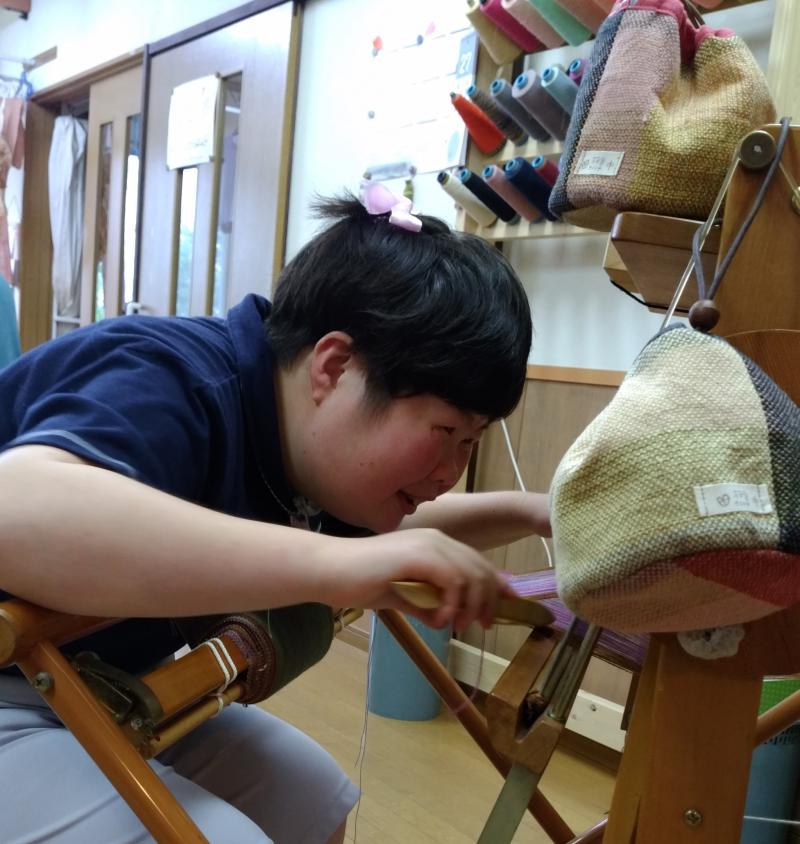 その織物をスタッフや親御さんが商品へと仕上げていきます。
