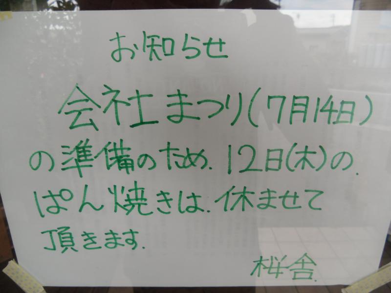 申し訳ありませんが、明日12日(木)のパン焼きを休みとさせていただきます。