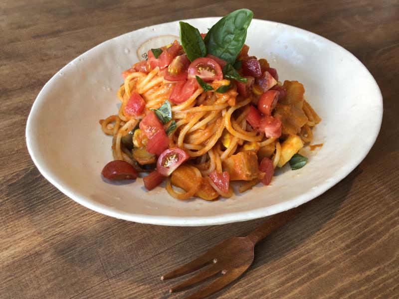 「季節の野菜をつかった重ね煮のトマトパスタ」1000円(サラダとスープ付)
