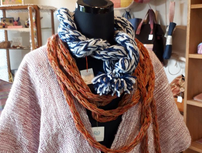 桜舎商店では、指編みマフラーも販売中。小ぶりなものなので、こんな風に重ねてつけても楽しいですね。