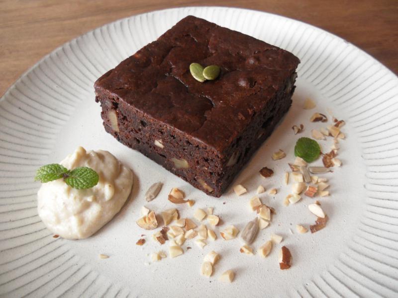 てんさい糖やメイプルシロップのやさしい甘みにちょっぴりの豆味噌やナッツでアクセントを添えたブラウニーができました。