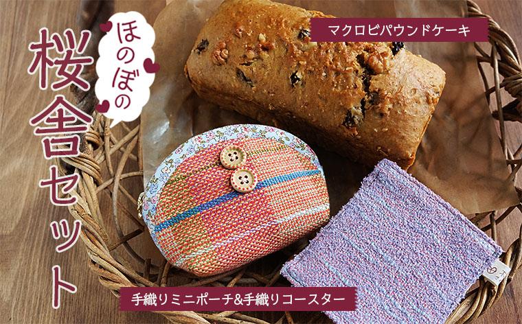 内容は、ほのぼの桜舎セット(マクロビレーズンパウンドケーキ1本、手織りミニポーチ1つ、手織りコースター1枚)です。