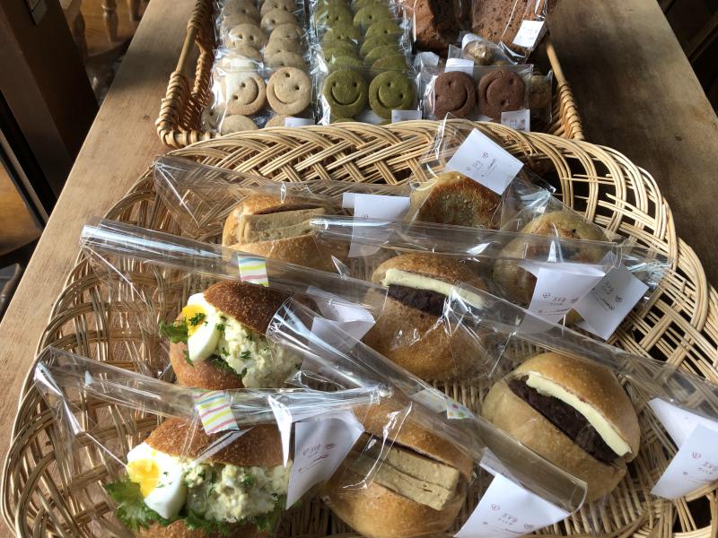 ラズベリーくりーむサンドや、自家製マヨネーズ平飼いたまごサンド、あんバターサンド、季節のおやきなどいろいろならびますよ~♪