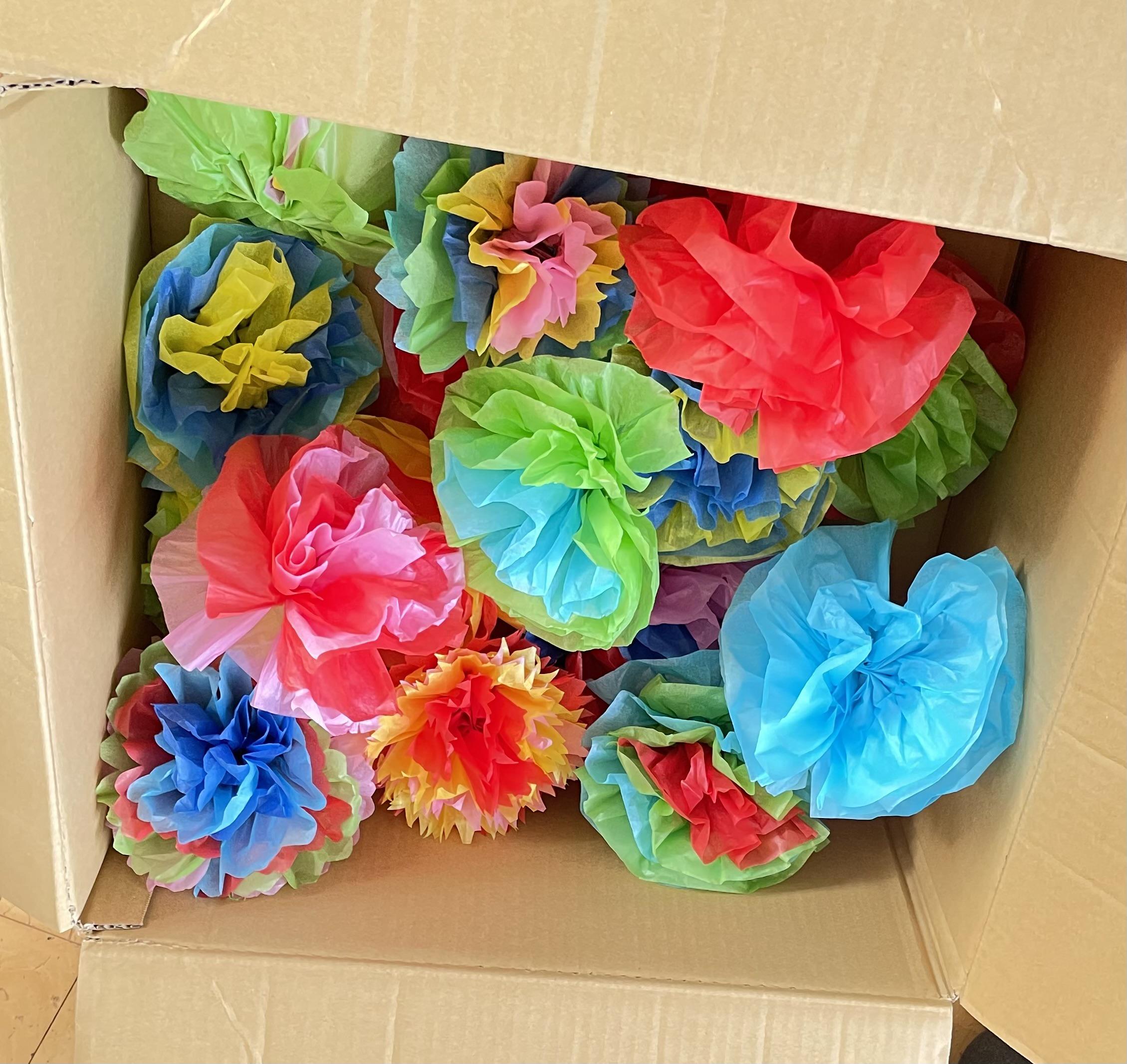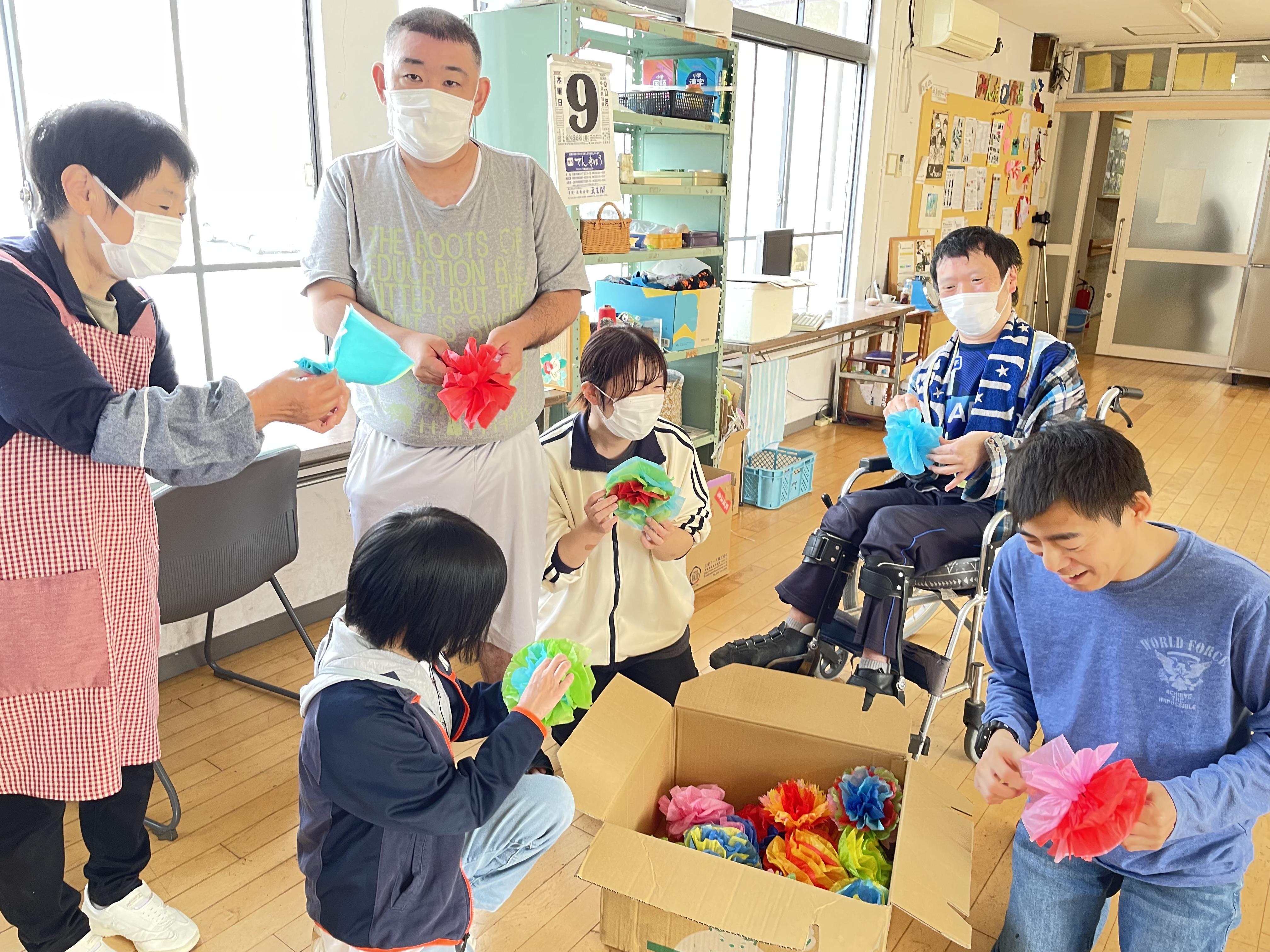 今日は生活介護の利用者さんが、メイン看板を彩るお花づくりに挑戦