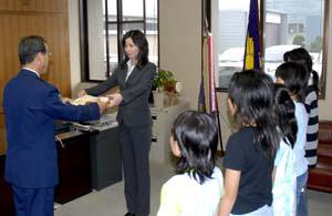 表彰式では、島津光男署長が「知らない大人から声を掛けられたとき、誘いを断りすぐに通報してくれました。その勇気と正しい行動をたたえます」と児童5人に褒賞、田中さんには感謝状をそれぞれ贈った。