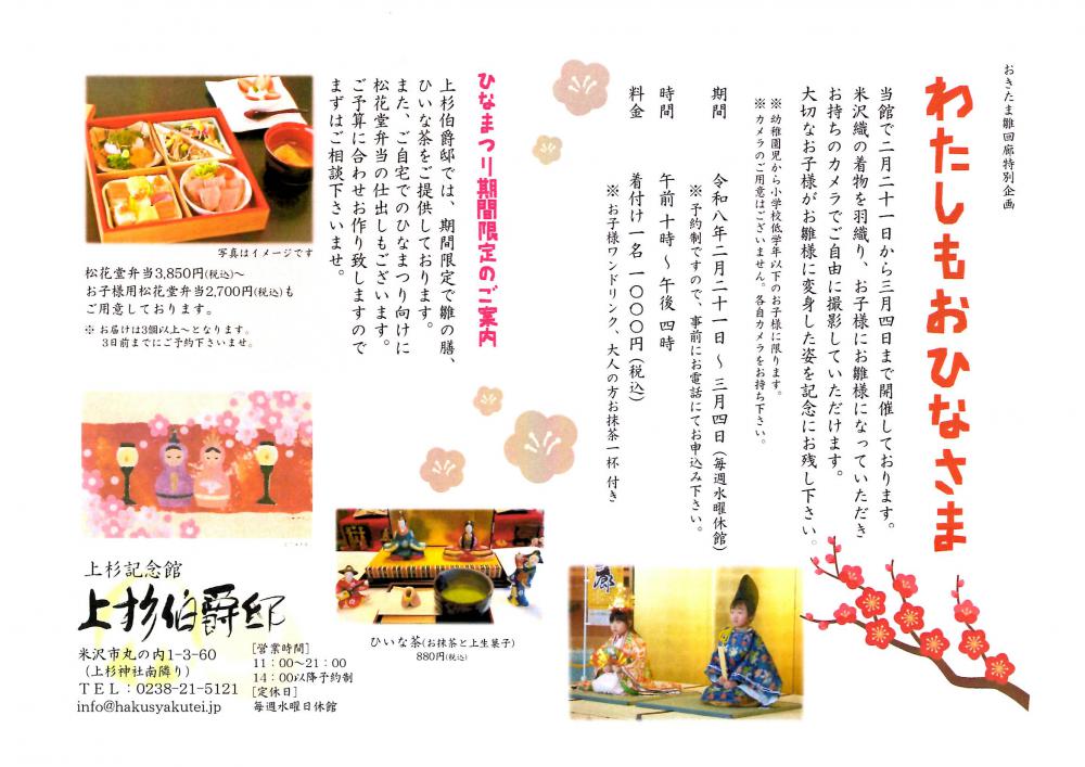 上杉伯爵邸では、2月21日(土)~3月3日(火)まで「わたしもおひなさま」を開催します。