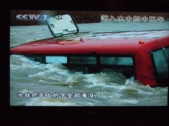 たしか湖南省あたりの今年の洪水で、道路に氾濫した水が流れ込んだところにバスが、はまってしまったとき、乗客が助かったときの番組のようです。完全にバスが水没してます。