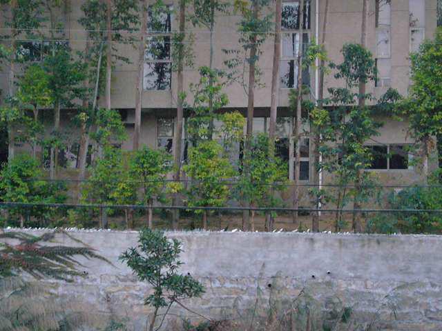 侵入防止の土留めの塀です。上端部にガラスの破片が一杯立っています。