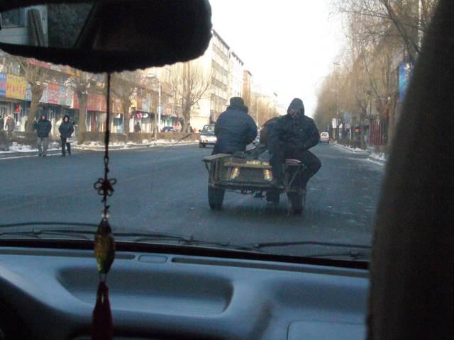 すごいです。馬車です。聞いたら牛もあるそうです。。乗ってる人はマフラーで顔を覆って、眼だけ出しています。