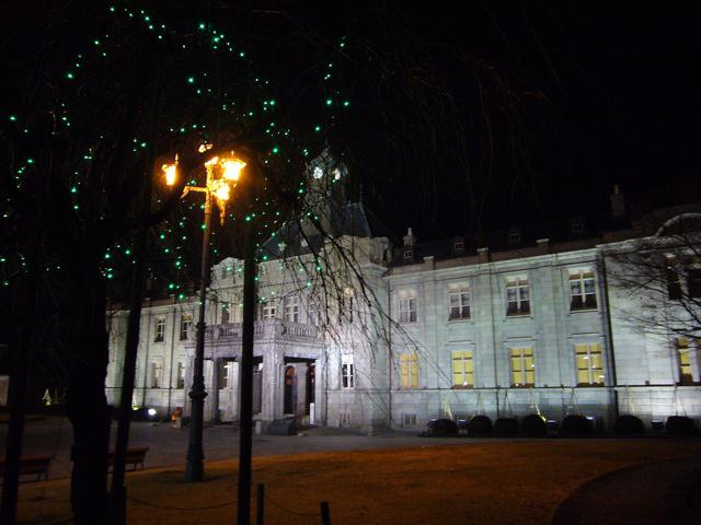 内部の庭に派手じゃないけど緑のイルミネーションあった。オレンジ色のやさしいライトとの色合いが白い建物の壁にとてもいい。