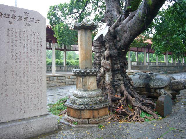 1989年に改修を行った記念碑と古い層塔と、古木。