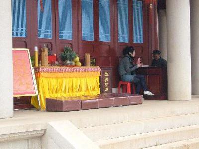 観音閣で占いをしてもらっている女性です。3〜4回も占っているので つい撮ってしまいました。正面のところで膝をついてお祈りしながら小さな竹のようなものを後ろに落とします。それで出たものを横のおじさんに持って行って占ってもらっていました。多分結婚のことだろうって言っていました。どこでも一緒ですね。