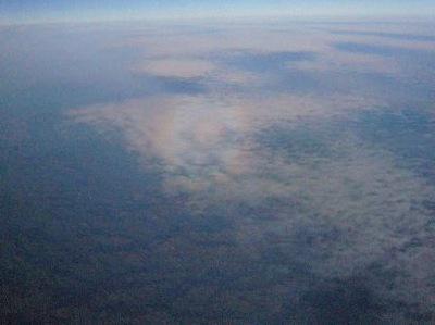 帰りの飛行機が、夕方で東に向かうときは背後から陽を受けます。すると丸い虹が現れました。