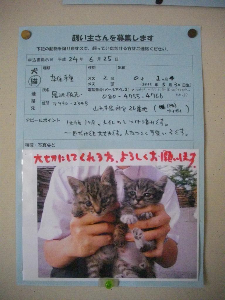 この写真の左側の子猫がまだ里親が居ません。希望のある方は写真の中の連絡先まで電話ください。