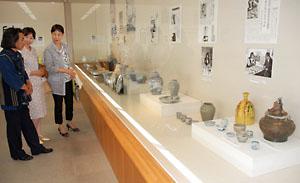 (記事および写真は、山形新聞webより転載。〜上の畑焼を復興させた伊藤瓢堂さん(左)のこれまでの作陶を紹介する「瓢堂の世界展」=山形市・山形美術館)