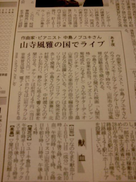 ▼山形新聞朝刊に『中島ノブユキ スモール・アンサンブル ライブ in山寺』