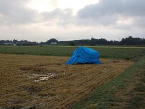 朝のウォーキングコースの田んぼの中を通ると稲が刈り取られた田んぼにコンバインがブルーシートで囲まれて置かれていました。いよいよ稲刈りが始まったようです。昨日の夕方から雷まじりの大雨が降りましたが、その前に刈り取りを終了したようでタイミングバッチリといったところでしょうか。例年この時期になると大雨で稲が倒れ刈り取りが大変そうな田んぼがでてくるのですが今年は順調そうです。