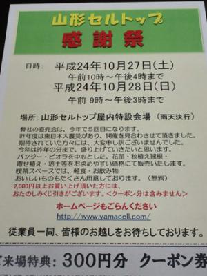 昨日お伺いしたお客様は野菜や花の苗を作る会社に勤めておられます。場所は中山町岡。年1回社内を解放して花苗や秋植え球根の販売を行っています。製造元での即売会です。寄せ植えの実演なども行われるよう。頂いたチラシには300円のクーポン券もついていました。ご希望の方は私までご連絡ください。喫茶コーナーでは無料の軽食や飲み物も用意されているよう。ヤキトリは無いらしい。